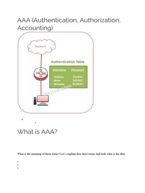 First up, we have Authentication . This is like showing your ID at the door. Authentication is the process of verifying a user’s identity. It’s the first step in the AAA process, and it’s all about confirming that you are who you claim to be. This is where you prove your credentials. You might enter a username and password, scan a fingerprint, or use a security token. The network checks these credentials against a database to confirm a match. If the authentication is successful, you’re in! You’ve passed the first test, and the network knows who you are. The authentication process can use several methods, the most common being: