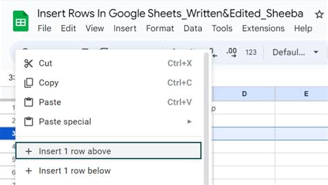 3. Insert Option: In the menu, you’ll see options like “Insert 1 row above” or “Insert 1 row below.” Choose the one that fits your needs. “Above” will add the new row above the selected row, and “below” will add it below.