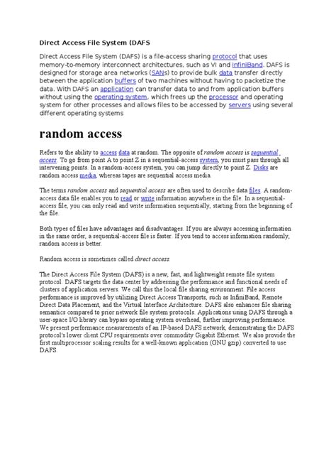 At its core, a direct access file, also known as a random access file , is a type of file that allows you to read or write data from any location within the file without having to process the data that comes before it. Think of it like flipping through a book. If you want to read page 50, you don’t have to read pages 1 through 49 first, right? You can just directly jump to page 50. That’s the essence of direct access. This is a stark contrast to sequential access files , where you must read data in order, from the beginning to the end. Imagine if you had to read the entire book from the start every time you wanted to find a specific sentence – that would be incredibly slow and inefficient!