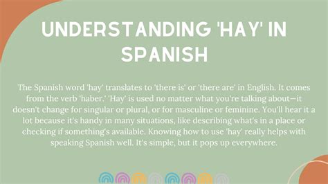 “Hay” is a fundamental word in Spanish that expresses existence in a general way. While it may seem simple, understanding its nuances and avoiding common mistakes is crucial for effective communication. By studying its meaning, usage, and common phrases, and by practicing regularly, you can confidently incorporate “hay” into your Spanish vocabulary and speak more fluently. So go ahead, start using “hay” in your conversations and watch your Spanish skills blossom! You got this, guys!