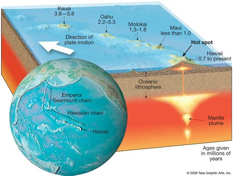 So, what’s this ‘something else’? It’s a plume of hot rock rising from deep within the Earth’s mantle, basically the layer of the Earth between the crust and the core. This plume is incredibly hot – way hotter than the surrounding rock – and it melts the crust above it. This melted rock is what we know as magma, and it’s what eventually erupts to form a volcano. This plume is relatively stationary, while the tectonic plate above it slowly moves. The result? A chain of volcanoes, with the oldest ones farthest from the hotspot and the youngest ones directly above it. The classic example is the Hawaiian Islands, which are all formed by the same hotspot. Each island represents a stage in the movement of the Pacific plate over this plume of hot mantle rock.