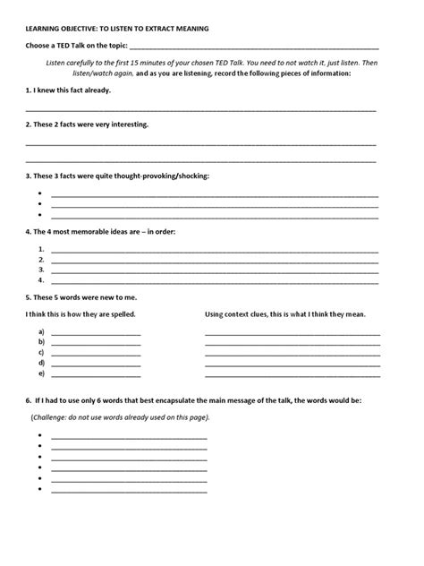 Alright, so we’ve established that Ted Talks are awesome. But what happens when you bundle them up into a Ted Talk listening exercise PDF ? Suddenly, they become a structured, actionable learning tool. Think of it this way: a Ted Talk on its own is like a beautiful, complex meal. A listening exercise PDF is the recipe, the ingredients list, and the chef’s tips all rolled into one. It guides you through the experience, making sure you don’t just hear the words but truly understand them. These PDFs typically come packed with features designed to maximize your learning. You’ll often find pre-listening activities to warm up your brain and introduce you to key vocabulary or concepts. This is super helpful because it primes you for what’s coming, reducing that feeling of being lost from the get-go. Then comes the actual listening part, often broken down into segments with comprehension questions . These aren’t just simple ‘yes/no’ queries; they often require you to recall details, understand the main ideas, identify the speaker’s tone, or infer meaning. This active questioning forces you to engage deeply with the audio. Vocabulary builders are another huge plus. You’ll get lists of new words and phrases from the talk, complete with definitions and example sentences, often showing how they were used in the context of the talk . This is miles better than memorizing random words from a dictionary. Many PDFs also include transcripts , which are invaluable. Being able to follow along with the words as you listen, or re-listen to specific parts while reading, solidifies your understanding and helps connect the sounds to the written form. After listening, you’ll usually find post-listening activities like discussion prompts or writing tasks. These encourage you to think critically about the content, express your own opinions, and practice using the new vocabulary and structures you’ve encountered. They transform passive listening into active learning and production. Essentially, a Ted Talk listening exercise PDF takes the raw material of a fascinating talk and provides a structured framework for analysis, comprehension, and language acquisition. It transforms a potentially passive experience into an active, guided journey of discovery, ensuring that every minute spent listening yields maximum benefit for your English proficiency. It’s the difference between watching a movie and studying it for a film class – you get so much more out of it!