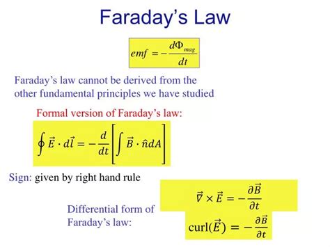 Okay, guys, let’s get a little nerdy and talk about the math, but don’t bail on me yet! It’s actually pretty straightforward and helps solidify our understanding of Michael Faraday’s Law . The mathematical expression for Faraday’s Law is often written as: $ \( \mathcal{E} = -N \frac{d\Phi_B}{dt} \) \(. Whoa, what does this mean? Let's break it down. The symbol '\) \( \mathcal{E} \) \(' represents the **induced electromotive force (EMF)**, which, as we discussed, is essentially the voltage generated. The 'N' stands for the number of turns in a coil of wire. If you have a single loop, N=1. If you have a coil with 100 loops, N=100. More loops mean a stronger induced EMF, which makes sense, right? Now, the really crucial part is '\) \(\frac{d\Phi_B}{dt}\) \('. This is the **rate of change of magnetic flux**. '\) \( \Phi_B \) \(' is the magnetic flux, and '\) \( d/dt \) $’ means ‘the change over time’. So, this term tells us how quickly the magnetic field is changing through the circuit. The negative sign in front of the equation is super important, and it relates to Lenz’s Law . Lenz’s Law states that the direction of the induced current will be such that it opposes the change in magnetic flux that produced it. Think of it as nature’s way of pushing back. If you’re trying to increase the magnetic field through a loop, the induced current will create its own magnetic field in the opposite direction to try and counteract that increase. If you’re trying to decrease the magnetic field, the induced current will create a magnetic field in the same direction to try and keep it from decreasing. This opposition is crucial for conservation of energy. Without it, we could create energy out of nothing! So, the negative sign is a constant reminder that the induced current always fights against the change. Understanding this relationship between the rate of flux change, the number of turns, and the opposing nature of the induced current is key to mastering Faraday’s Law and its applications. It’s this elegant mathematical formulation that allows engineers to precisely calculate and design systems that harness electromagnetic induction effectively.