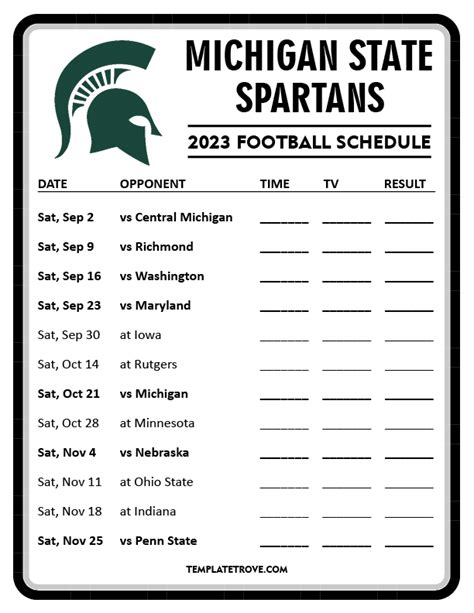 Want to stay in the loop? Here’s how you can keep up with the latest MSU football schedule and news. First, make sure you’re following the official Michigan State Athletics website. This is your go-to source for the most accurate and up-to-date information. You can also follow the team on social media platforms like Twitter, Facebook, and Instagram for real-time updates, behind-the-scenes content, and breaking news. Another great way to stay informed is to subscribe to the official Michigan State Athletics newsletter. This will deliver the latest news and announcements directly to your inbox. Additionally, consider downloading the official Michigan State Athletics mobile app for easy access to schedules, scores, and other important information. And don’t forget to tune into local sports radio and television broadcasts for expert analysis and commentary. By utilizing these various resources, you can ensure that you’re always in the know about the Spartans and their upcoming games. Stay connected and show your support for the Green and White as they embark on their exciting journey to success.