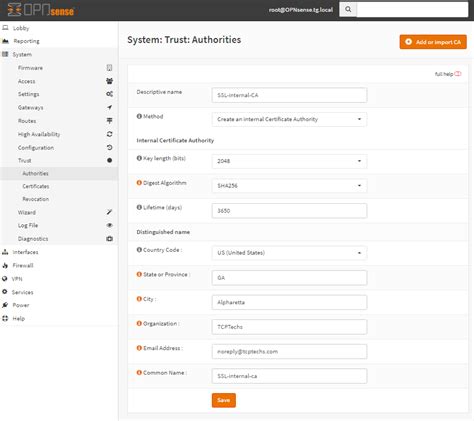 • Generate a Certificate Authority (CA): If you don’t already have one, you’ll need to generate a CA. Go to System > Trust > Authorities and click the + button to create a new CA. Fill in the required information, such as the name and lifetime of the CA. Make sure to choose a strong password to protect the CA.
