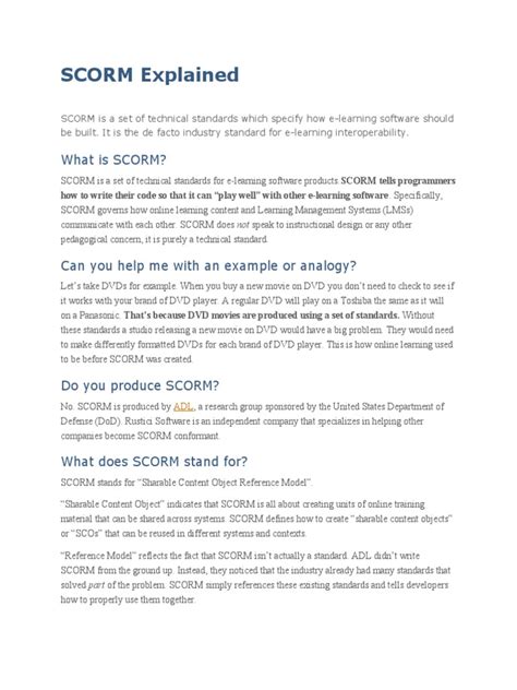Okay, so why should you, my awesome readers, actually care about the SCORM manual? Well, guys, it boils down to making your life so much easier and your e-learning projects way more successful . First off, interoperability . This is the big one! If your course content isn’t SCORM compliant, it might only work with one specific LMS. That’s like buying a game that only works on one console – super limiting! A SCORM manual ensures your content can be plugged into virtually any SCORM-compliant LMS out there. This means you’re not locked into a single vendor and have the flexibility to switch or use multiple platforms. It’s all about future-proofing your investment in e-learning content. Secondly, tracking and reporting . The magic of SCORM is its ability to communicate learner progress back to the LMS. The SCORM manual specifies exactly how this communication happens – how completion status is reported, how scores are sent, how much time a learner spent. This detailed data is vital for understanding learner engagement, identifying areas where learners struggle, and proving the effectiveness of your training. Without this standardized communication, you’d be left guessing or dealing with messy, inconsistent data. Thirdly, reusability and efficiency . Once you’ve built SCORM-compliant content, you can reuse it across different courses and different LMSs. This saves an incredible amount of time and resources. Instead of rebuilding content for every new platform or update, you just package it correctly once. The SCORM manual guides you on how to package your content (usually as a .zip file) so that it contains all the necessary files and metadata for the LMS to understand. Finally, compliance and quality assurance . Adhering to SCORM standards ensures a certain level of quality and functionality for your e-learning. The manual acts as a benchmark, helping you and your developers create content that meets industry expectations. When you’re creating training for regulatory purposes or for large organizations, compliance with standards like SCORM is often non-negotiable. So, knowing the ins and outs of the SCORM manual helps you avoid costly errors, ensure your content works as intended, and deliver a professional, effective learning experience for your audience.