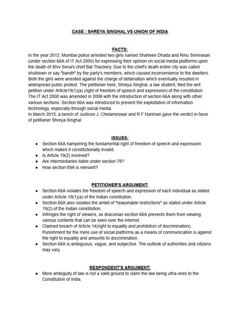 The arguments against Section 66A were strong and focused on several key points. The main one was that the law violated Article 19(1)(a) of the Indian Constitution, which guarantees the right to freedom of speech and expression. The petitioners argued that the law was overly broad and vague, giving the government too much power to restrict speech. They also pointed out that the law was being misused to arrest people for innocuous posts, which was a clear abuse of power. The petitioners presented these arguments in the Supreme Court, and they formed the basis of the case against Section 66A.