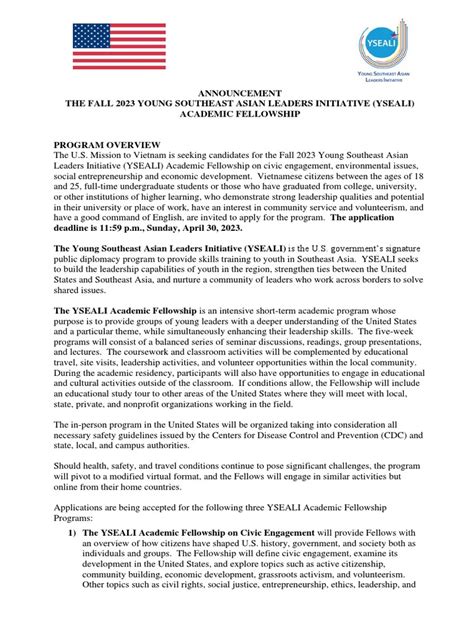 Alright, guys, that’s the lowdown on the Spring 2022 YSEALI Academic Fellowship . It’s a fantastic opportunity for young leaders from Southeast Asia to gain invaluable experience, build their skills, and make a real difference in the world. I hope this guide helps you understand everything you need to know about the fellowship, from the eligibility requirements to the application process, and gives you the confidence to apply. Remember, it’s a competitive program, but with careful preparation and a genuine passion for making a difference, you’ll be well on your way to success. Good luck with your application, and I hope to see you thriving as a YSEALI Fellow! Now go out there and make it happen !