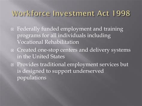 So, what exactly is the Workforce Investment Act ? In a nutshell, WIA was a landmark piece of U.S. federal legislation designed to overhaul the nation’s job training system. Enacted in 1998, its primary goal was to create a more flexible and effective workforce development system. This system would help job seekers find employment and help businesses find skilled workers. Think of it as a massive, nationwide effort to connect people with the skills they need to thrive in the job market, and simultaneously give businesses access to a ready pool of qualified candidates. The emphasis here was on a demand-driven approach. This means the programs were designed to respond to the actual needs of employers in different industries and regions. This approach was a significant shift from previous job training programs that were often criticized for being disconnected from real-world job requirements. WIA aimed to solve this problem by involving businesses directly in the planning and delivery of training programs. Businesses had a seat at the table to advise, and help shape programs so that they match the skills their new employees will need to succeed.